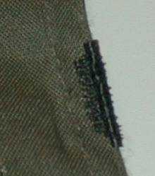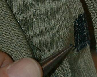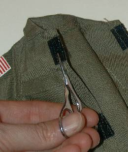 Eventually, if careful, all Velcro can be removed from the stitching without destroying the stitching. Repeat this procedure with all of the Velcro on the jacket, pants, and even the belts and backpacks. The trousers are not nearly as important because the fly is on the back of the figure. One can turn them around, but the pockets won't be positioned correctly. The hanging jacket will cover up the fly anyway. This is a time consuming and tedious process so BE PATIENT! |